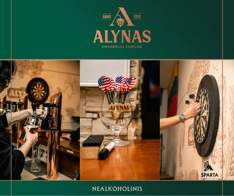 ALYNAS – didžiausias pilstomo alaus tinklas Lietuvoje. Kviečiame aplankyti daugiau nei 30 kranerijų, įsikūrusių skirtinguose miestuose. Čia galite maloniai praleisti laiką degustuodami mėgstamus gėrimus ir užkandžius, įsigyti šviežiai įpilto alaus išsinešti. Kartą paragavę alaus tiesiai iš mūsų krano, pastebėsite didelį skirtumą nuo išpilstytų pasterizuotų gėrimų. ALYNUOSE visada rasite platų natūraliai pagaminto ir šviežio alaus pasirinkimą draugiškomis kainomis.